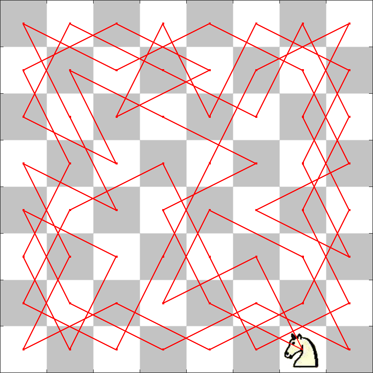 马踏棋盘算法,也称骑士周游问题。在一个 8x8 的国际象棋棋盘上,用一个马按照马步(即走日字,同中国象棋的马的走法)跳遍整个棋盘,要求每个格子都只跳一次,最后回到出发点。