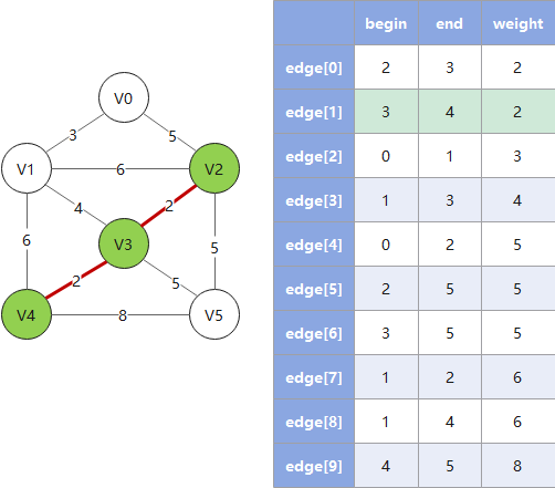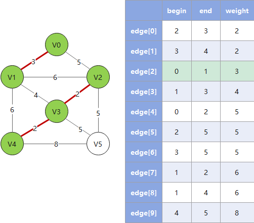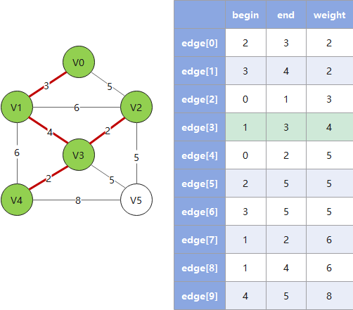 - 4. 重复 2、3,直到遍历完所有的边,此时已形成最小生成树
